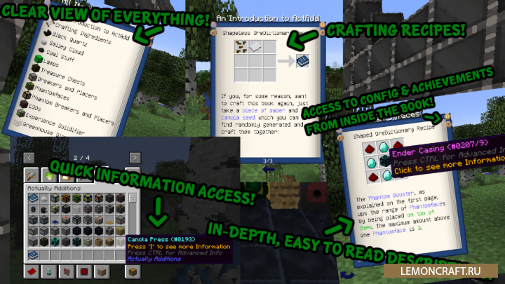 Индустриальный мод Actually Additions добавляет в игру много новых блоков, механизмов, оружия и брони. Кроме этого, после установки мода, вы сможете найти новые виды растений, новые руды, лазеры, автоматизированные фермы и много других полезных штук. Мод имеет встроенную инструкцию по изучению всех особенностей мода. Мод достаточно обширный, так что готовьтесь затратить немного больше времени на его освоение.
