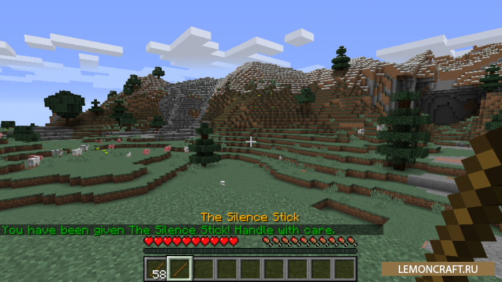 Мод на палку тишины Silence Mobs дает вам возможность сделать выбранных вами мобов немыми, т.е. они не будут издавать никаких звуков. Для этого вы можете использовать обычную палку из вашего инвентаря. Берете в руку эту палку, прописываете команду /st и у вас появляется волшебная палочка, которая заставит замолчать моба. Достаточно прикоснуться этой палочкой до моба и но станет беззвучным. Если вам надоели звуки блеяния ваших овец в загоне, например, этот мод именно то, что вам нужно.
