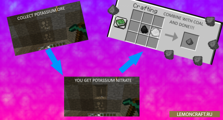 Мод на новый порох Bombastic Solution даст вам возможность получить порох не убивая крипперов. В игре появится новая руда, с помощью которой можно будет скрафтить порох. Новая руда называется Pottasium, из нее нужно получить пыль, которая называется Kaliumnitrat. Далее, соединяем эту пыль с углем и получаем порох. Теперь вам не нужно устраивать целые фермы криперров, что бы иметь достаточно пороха.