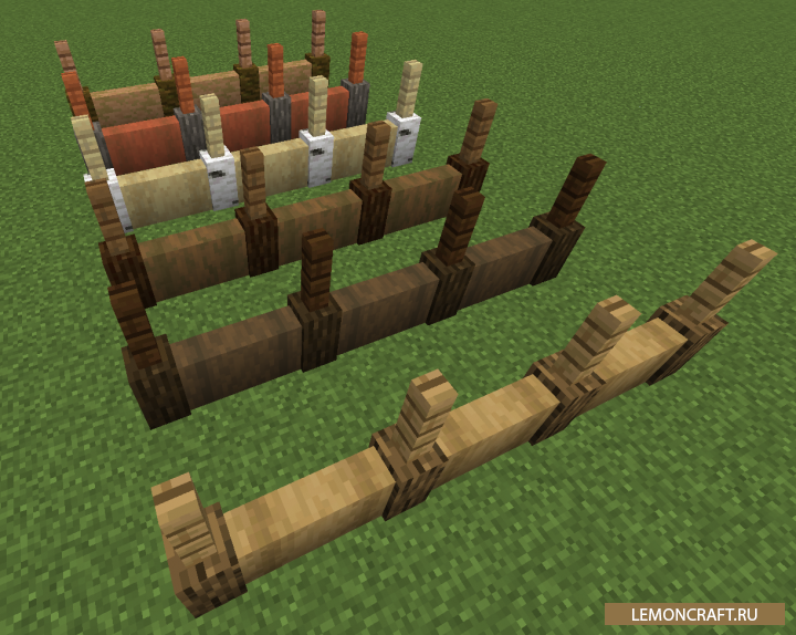 Мод на предметы и блоки из дерева I Like Wood добавит в игру большое количество новых предметов и блоков из дерева, цветовая гамма которых будет соответствовать материалу из которых они созданы. В игре появятся новые заборы, бочки, сундуки, кровати и верстаки. Все предметы можно создать из темного и светлого дуба, акации, березы, дерева из джунглей и ели.