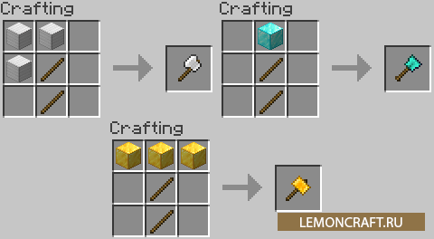 Мод на новые инструменты Practical Tools добавит в игру три новых, эксклюзивных инструмента: excavator, hammer и greataxe. С помощью данных инструментов вы сможете разрушать сразу 9 блоков. Разбив один блок вы разрушаете еще 8 окружающих его. Excavator может быстро выкопать яму или вскапать землю, hammer позволяет разрушать каменные породы, greataxe позволит срубить все дерево целиком, главное разрушить нужный блок.