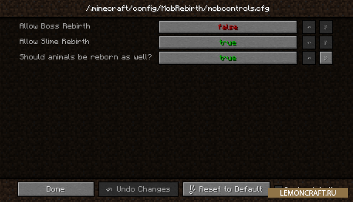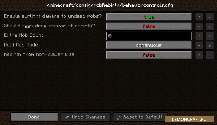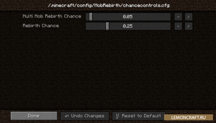 Мод на бессмертных мобов Mob Rebirth позволяет некоторым мобам оживать после своей смерти с определенной вероятностью. В конфигурационном файле мода вы сможете произвести настройки данной возможности для определенных видов мобов. Так же в настройках можно настроить выпадение яиц призыва, вместо возрождения или отключить влияние солнца на нежить.