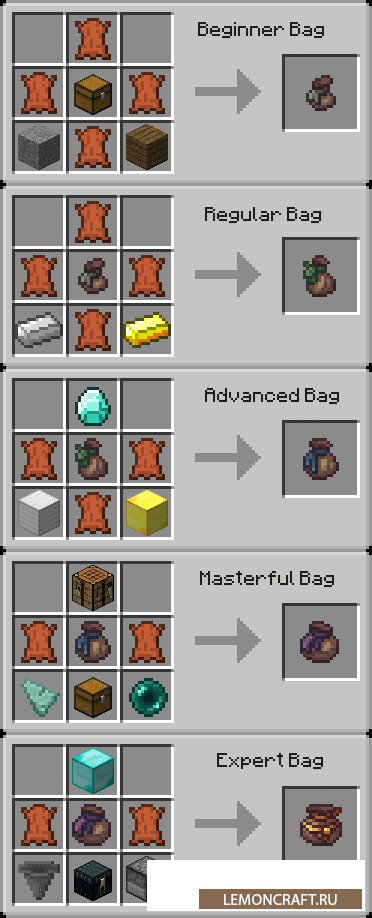 Мод на упрощение строительства Builder's Bag совмещает в себе функции большого количества модов позволяя тем самым намного упростить процесс строительства. В игру будут добавлены специальные сумки, внутри которых будут создаваться ресурсы. Данные ресурсы вы сможете использовать в процессе строительства. Мод поддерживает работу с такими модами, как Chisel, Chisels and Bits, Little Tiles, Linear.